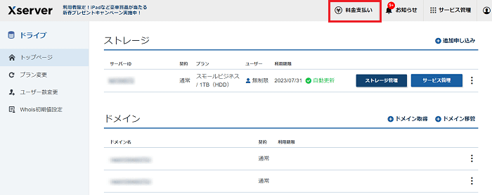 XServerアカウントへログインし、上部メニューの「料金支払い」をクリックしてください。